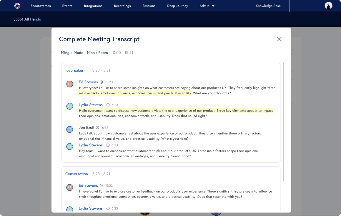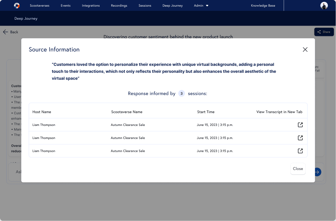 Being able to query all Scoot meetings is a very valuable MVP – but future versions could include the ability to import and integrate additional data and content from external meetings, CRMs, and other databases in order to make Deep Journey the true source of truth for insights on the entire sales cycle.